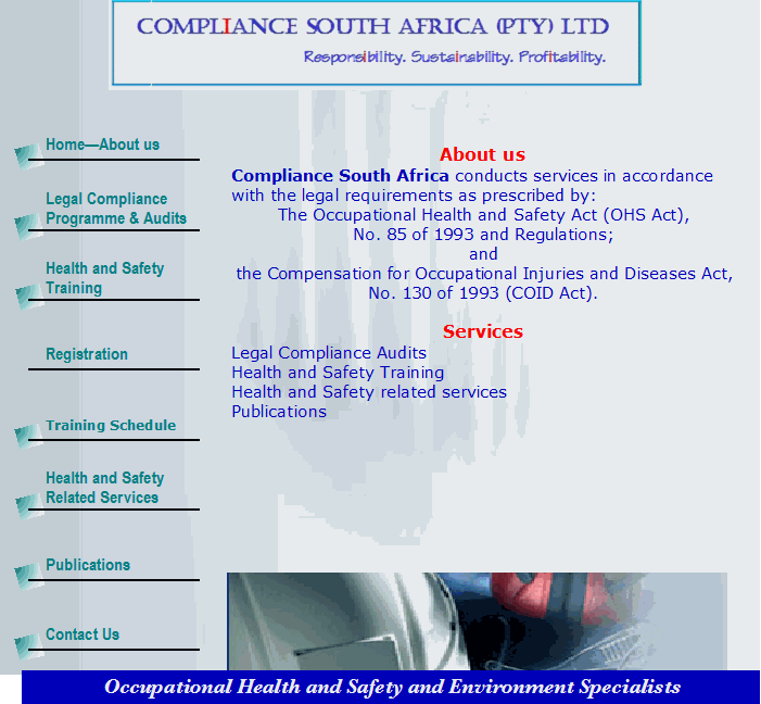 Home--About us | Legal Compliance Programme & Audits | Health and Safety Training | Registration | Training Schedule | Health and Safety  Related Services | Publications | Contact Us